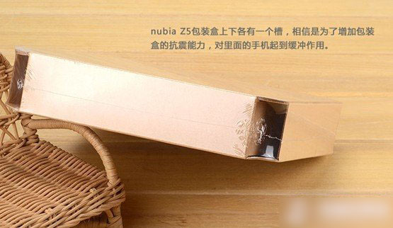 Nubia Z5包装盒上下各有一个槽,相信是为了增加包装盒的抗震能力,对里面的手机起到缓冲作用。