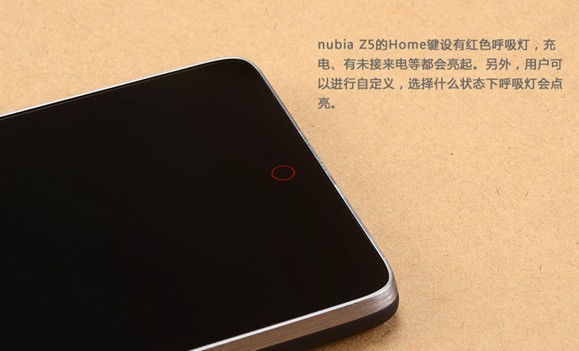nubia Z5的Home键设有红色呼吸灯,充电、有未接来电等都会亮起。另外,用户可以进行自定义,选择什么状态下呼吸灯会点亮。