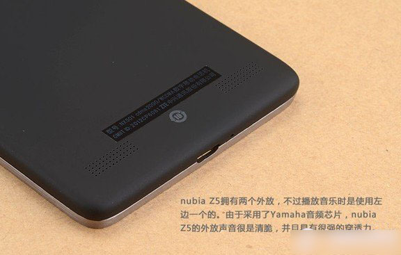 Nubia Z5拥有两个外放,不过播放音乐时是使用左边的一个。由于采用了Yamaha音频芯片,nubia Z5的外放声音很是清脆,并且具有很强的穿透力。