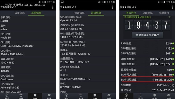 性能方面,努比亚Nubia Z5采用了高通APQ8064 1.5GHZ四核,2GB RAM和32GB ROM的搭配,性能表现还是让人感到很满意的。另外努比亚nubia Z5内部存储的读写速度相当不错,这也是高速连拍的有力保障,通过安兔兔跑分测试,我们可以看到努比亚 Z5安兔兔跑分达到了19437分,达到了相当高的水平。