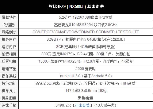 备:努比亚Z9分为三大版本,其中Z9经典版使用3GB+32GB内存,售价3499元;精英版使用4GB+64GB内存,售价3999元;尊享版使用4GB+64GB内存,并支持指纹技术,售价4499元。
