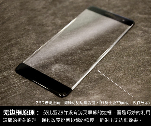 首先我们给努比亚Z9的定义是“无边框理念”,而不是真正的“无边框设计”,为何有此一言,主要是因为从科学和专业的角度上去看,努比亚Z9并没有消灭屏幕的边框,而是巧妙的利用玻璃的折射原理,通过将屏幕进行斜边处理,让边框“变相隐形”。简单来说,就是通过改变屏幕边缘弧度,折射出来无边框。