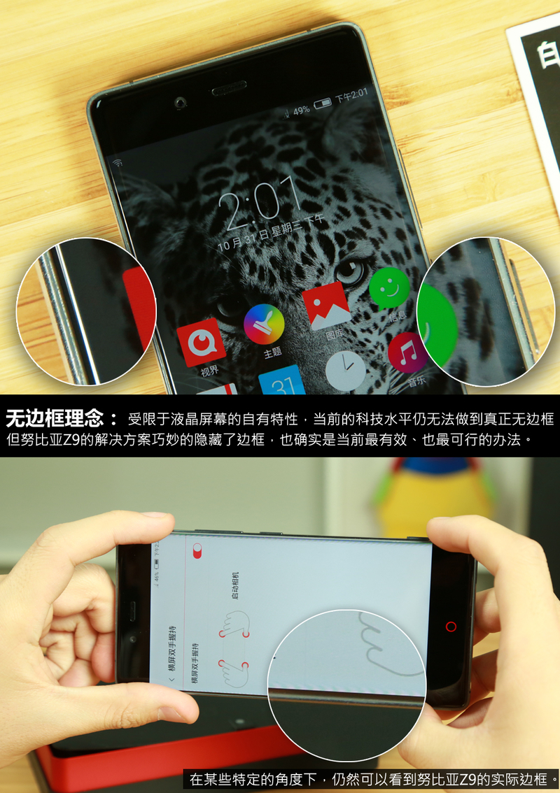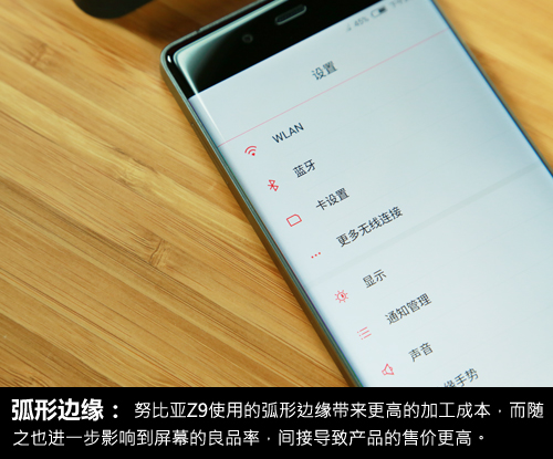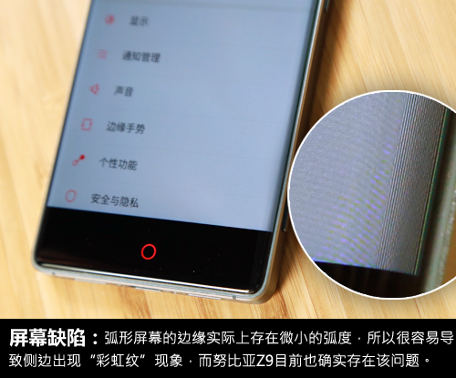 另外关于有用户疑惑当前的无边框技术是否有缺点时,其实目前也是存在的。除了刚才上文提到的无边框理念下的2.5D玻璃相对会更厚这项物体不足外,还有一个就是,弧形屏幕边缘实际上存在微小的弧度,很容易导致侧边出现彩虹纹现象,这是玻璃折射产生的不良效果,而努比亚Z9目前也存在这现象。如何能解决这个问题?根据当前情况来看,只能通过对硬件的导光结构进行调整,才能使使屏幕边缘有更好的视觉过渡,所以这点上努比亚还需持续完善。