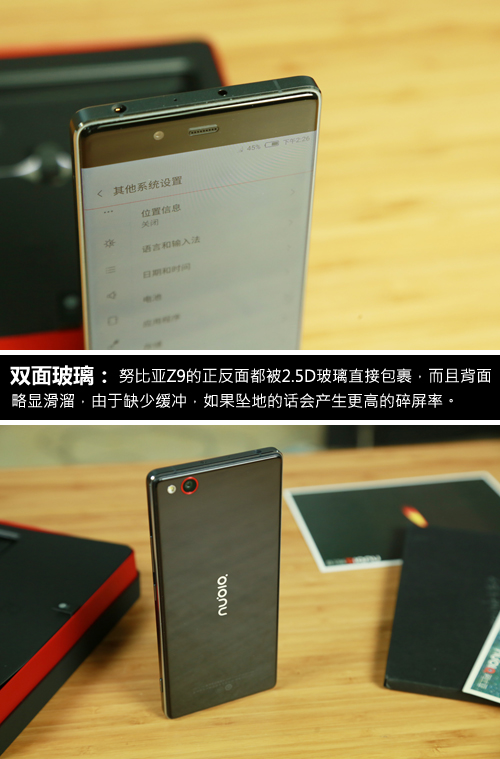 在加上努比亚Z9背面同样是2.5D玻璃,防滑性又进一步降低,手机在平整放置的情况下如果受力会很容易滑动,所以这方面将要非常小心。我们在评测过程中就已经出现多次跌落,好在没有撞击到水泥地和硬物,否则将很难设想。另外有用户迟疑,购买皮套和碎屏险是否能有效保证?努比亚官方出品的皮套是一个解决方案,但会导致机身更加厚重;而碎屏险所要的经济支出,以及维修过程中的时间耗费,想必也是你不希望看到的,再说多一事不如少一事,所以如果你打算入手努比亚Z9,你务必为它的使用更加小心。