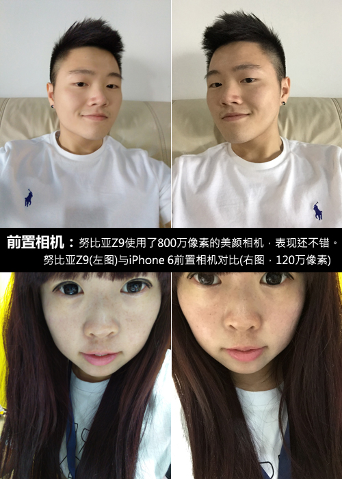 另外在自拍时,努比亚Z9是脸部自动对焦的,无法再手动调焦点。不过有个好处是所见即所得,不存在iPhone 6这样的镜像相反情况。