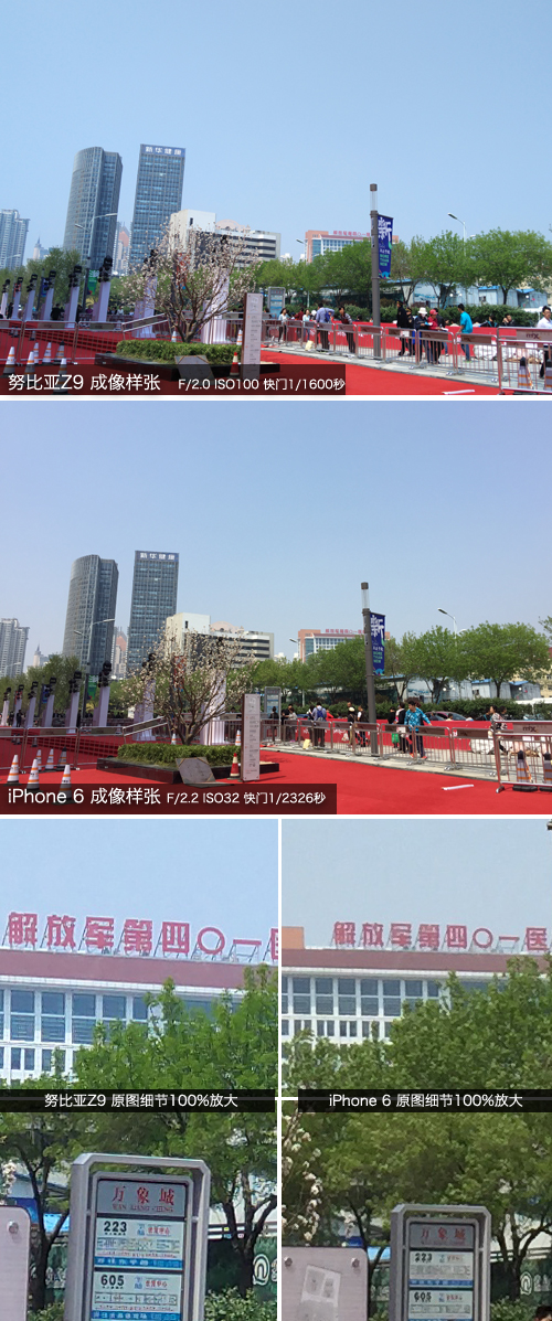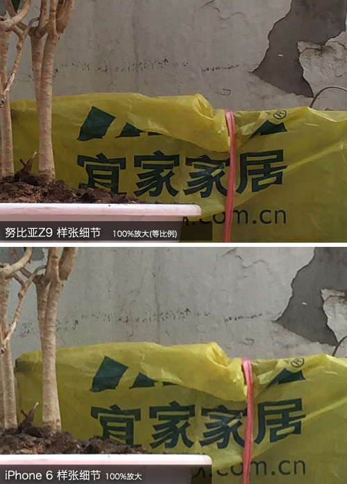 从努比亚Z9和iPhone 6的对比中可以看出,其实大体的结果还是和之前Z9 Max的表现相似,即努比亚Z9相比于iPhone 6有硬件上的优势。1600万像素(Z9)所展现出来的画面细节明显要比800万(iPhone 6)更加丰富,这点通过多个样张100%放大后的结果可清晰得知。另外努比亚Z9的成像在白天场景中依旧是典型的“暗中求稳”,通过低ISO来保证画面的完整性,而iPhone 6的成像效果则相对明亮些。