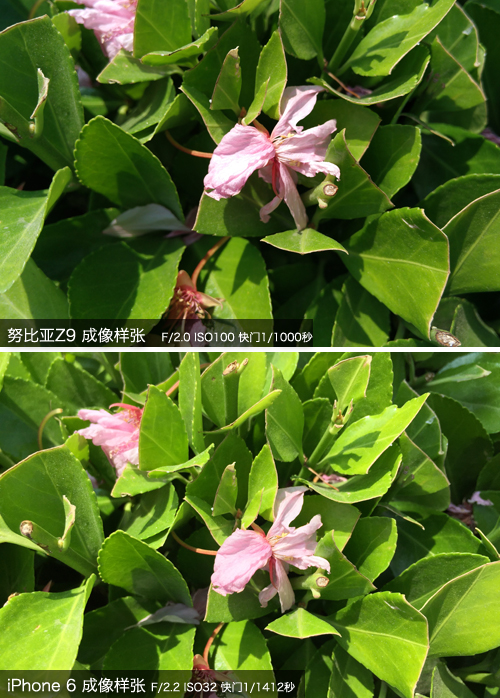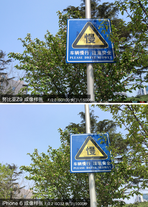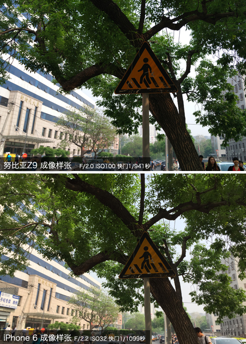 另外在白天的场景中我们意外的发现,在光线和色彩较为简单的情况下,努比亚Z9和iPhone 6差距不大,无非就是对画面明暗度的处理不同(和上文类似),但是显然努比亚Z9的细节和画面纯净度更高,虽然对场景的修饰有明显的后期软件强化效果,但也带给人更欢喜的感觉。在这点上我们认为努比亚Z9强于iPhone 6确实是一个事实。