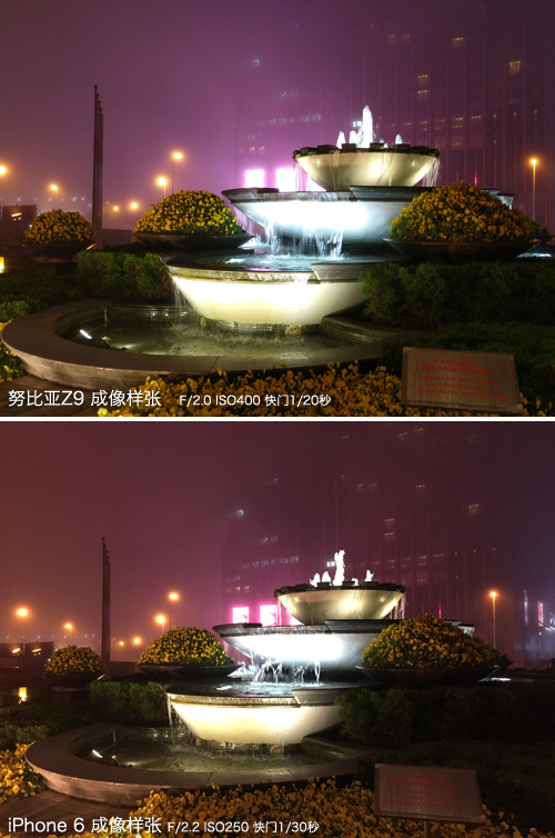 夜景拍摄部分,努比亚Z9比iPhone 6多了OIS光学防抖功能,但相比之下并没有带来相关的优势。首先我们能看到,二者对于夜景的处理方式是不一样的,努比亚Z9凭借更大的光圈使得画面的亮度、全局场景的还原上要比iPhone 6优秀不少,我们可以清晰的看到样张里的整体环境,包括喷泉、水池、楼房等,这是努比亚Z9的优势。
