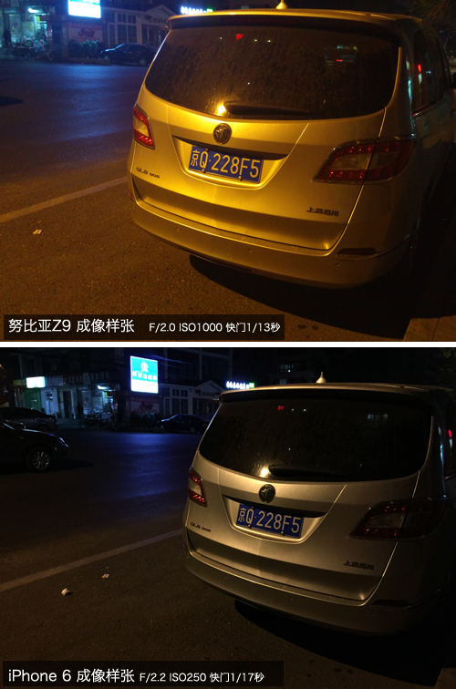 但不足之处在于,努比亚在夜景中很容易受到光线的影响,出现间歇性的白平衡错误,例如汽车的牌照发黄厉害,出现明显的偏色情况。而iPhone 6在这里虽然也同样没有做到100%准确,但大体还是和现场情况比较靠近,并且细节部分相对更优秀。