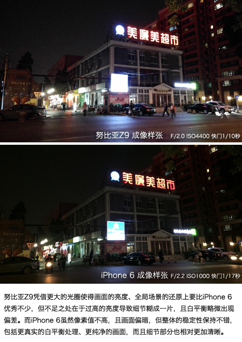 另外值得一提的是,在夜景的综合部分其实努比亚Z9的光学防抖功能并未发挥到极致,画面的稳定性依旧不是很高,很容易就拍糊,这点还有待持续提升。而iPhone 6虽然像素值不高,并且画面偏暗,但整体的稳定性还是不错的,包括更真实的白平衡处理、更纯净和完整的画面等。
