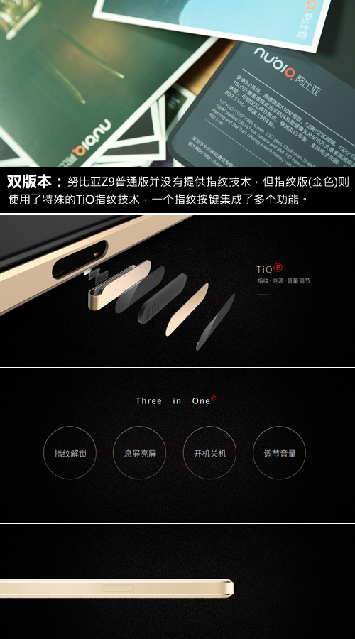 1、努比亚Z9的两个版本有什么区别?努比亚发布了两个版本的Z9,分别是普通版和指纹版,而指纹版顾名思义就是配备了指纹识别技术。并且和其它手机不一样的是,努比亚Z9指纹版取消了电源按键和音量按键,而是通过新增的指纹按键来实现解锁、开机、调节音量等几个功能,这一设计确实颇为创新。
