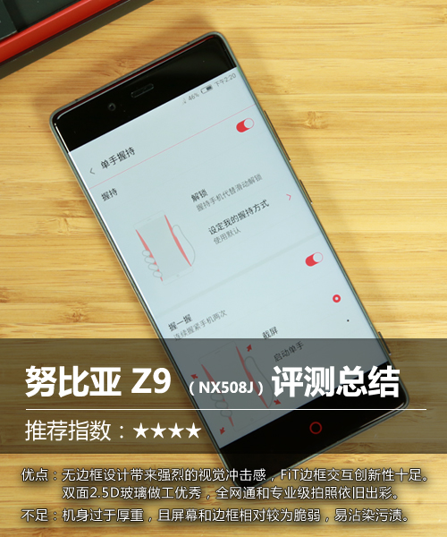 从努比亚Z9的无边框交互中我们看到,这些边框手势交互确实让我们眼前一亮,甚至多个功能已经可以取代目前的操作习惯,值得大力肯定。当然由于手势操作是手机行业内长远的议题,整体还有待继续优化和深究,所以我们也可以看到努比亚Z9还需要持续努力。但无论如何,努比亚针对无边框所做出的创新是成功的,至少在Z9这款产品上,已经走在国产其它品牌的前头,并且拥有和国际品牌抗衡的谈资,对于用户和行业来说,这都是一件好事。