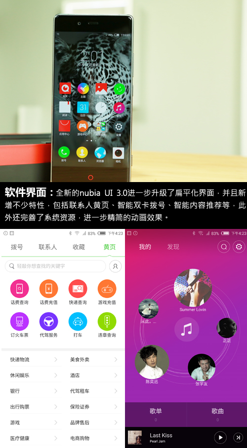 6、努比亚Z9使用的nubia UI 3.0有什么改进?此次努比亚Z9还升级到全新的nubia UI 3.0,基于Android 5.0,相比于Z9 Max(nubia UI 2.8)又有了进一步升级,例如图标上基本实现了全盘扁平化的特性, 并且新增了不少特性,包括联系人黄页、文字颜色自适应、智能双卡拨号、智能背景和智能音乐推荐等,此外还取消了努比亚曾经引以为豪的“黄金比例弹出效果”(点击文件夹时),可以说是努比亚的“自我批判和完善”。