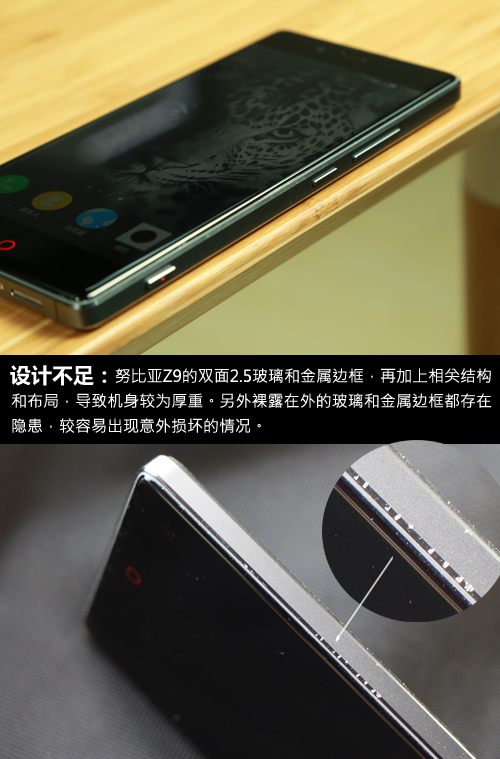 而努比亚Z9最大的缺点也同样衍生于这项技术,努比亚aRC工艺(弧面折射传导技术)所使用的2.5D弧面玻璃全部裸露在外边,机身也比较容易受力滑动,所以一旦落地将面临更大的碎屏风险,你必须时刻注意好你的手机安全。此外金属边框虽然使用了三层阳极氧化铝工艺,但由于设计结构问题,实际上是突出在边框外围,所以导致很容易就被磕碰出痕迹。