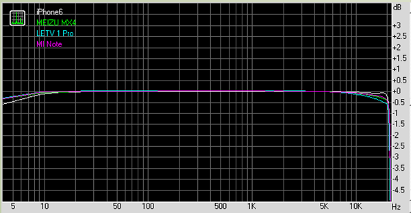 从4款机型的频响曲线来看,低频方面,乐1 Pro与魅族MX4和小米Note不分伯仲,苹果iPhone则在10Hz以下明显衰减。而高频方面,苹果iPhone 6表现最佳,小米Note和魅族MX4自6Hz开始衰减,乐1 Pro则较另外三款机型衰减更明显。