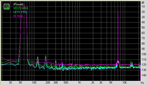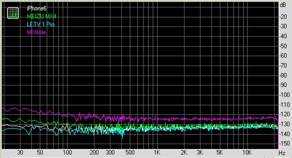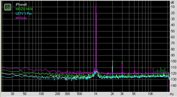 根据信噪比对比图中,可见乐1 Pro的信噪比是最佳的,达到102.5dB,与苹果iPhone 6(101.7dB)相比都处于整个频带的最下方,魅族MX4其次,也达到了理想的100dB,小米Note表现最差,不过92.4dB的信噪比也达到了CD机的标准。