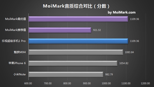 从上面的雷达图中,乐1 Pro的音质综合性能可以说非常优秀,五个子维度得与MoiMark最优值均十分接近,其中噪声水平以108.49高分数刷新了乐1此前107.79分记录(乐1之前纪录保持为苹果iPhone 6,分数105.72),综合水平达到MoiMark最佳。