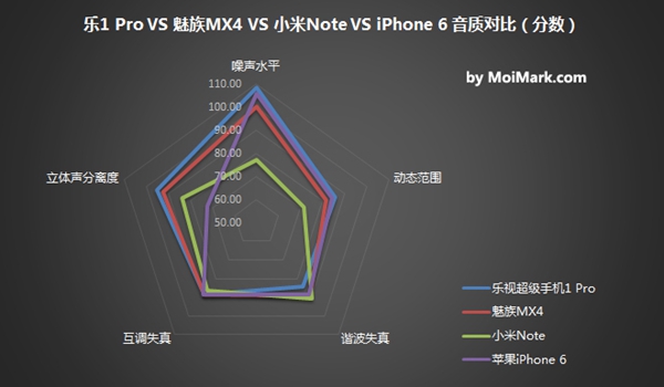 从雷达图直观反映,乐1 Pro与魅族MX4的音质各项维度都是颇为均衡的,二者之间乐1 Pro的优化更为出色,而小米Note和苹果iPhone 6均有不同程度的“偏科”,苹果iPhone 6仅在立体声分离度一项维度出现明显短板,而小米Note在噪声水平和动态范围维度都呈现出不足。