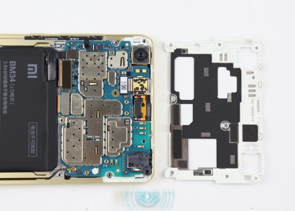 打开后盖,可以看到小米Note顶配版的内部结构,后盖背后有石墨散热片。