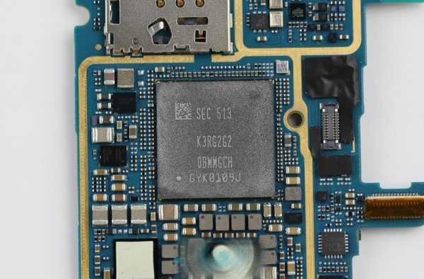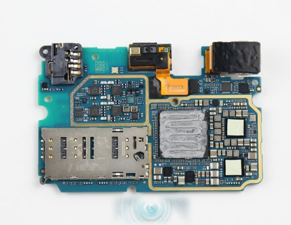 把硅脂清理以后,可以看到三星的内存芯片,型号是K3RG2G2,它是高速LPDDR4内存,容量4G。在内存芯片下方则是高通的骁龙810,由于它们是封装在一起的,所以这里也就不进行破坏拆解了。