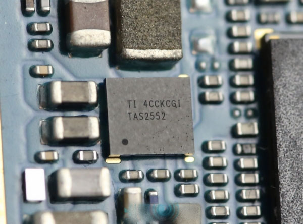 SABRE9018C2M,采用CSP封装,相对于以往的QFN封装的ES9018K2M,体积要小很多,为“寸土寸金”的手机空余了更多空间。在这颗芯片上方我们看到了金色的双时钟晶振。