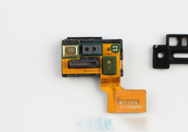 主板上还连接着听筒组件,断开排线即可拆卸,这块组件集合了光线感应器、距离感应器、降噪麦克风以及听筒几个功能。