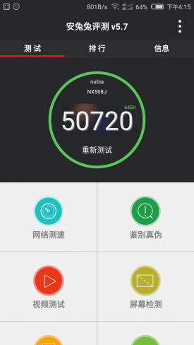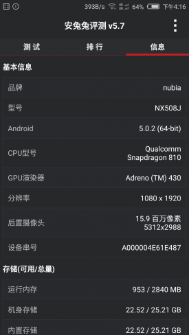nubia Z9是全球首款无边框手机,该机配备骁龙810拥有强大性能,并辅以3GB RAM和32GB ROM。处理器支持丰富的原生4K超高清界面和视频,同时配备升级版摄像头组件,支持陀螺仪稳定及3D降噪技术。此外骁龙810还集成14位双影像信号处理器,可支持1.2GP/s吞吐量以及最高5500万像素的图像传感器。接下来我们通过几个测试软件来看看骁龙810的性能到底如何。