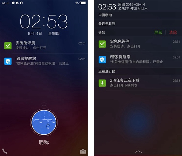 在手机解锁界面,向上滑动就可以解锁手机,在界面的左下角以及右下角都有快捷方式,可以直接从解锁界面跳转到拨号、拍照界面。在解锁界面我们可以查看下拉菜单的内容,如果手机有通知信息的话,不用解锁就可以获悉内容。