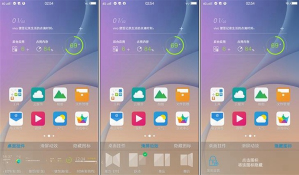 手机界面的图标还是原来Funtouch OS的风格,看久了也就习惯了。通过设置,我们可以在主屏上添加小插件,更改滑屏效果以及隐藏程序图标。