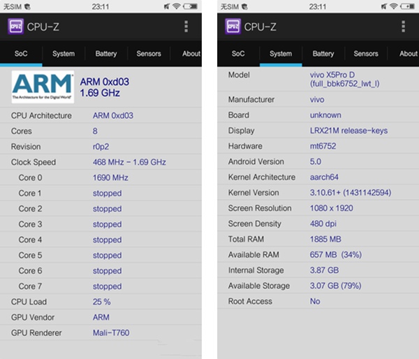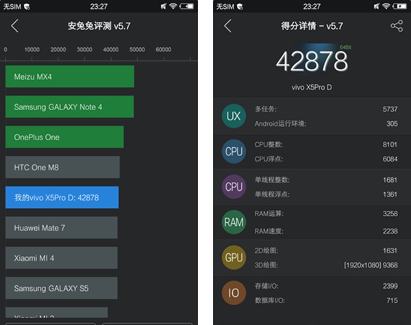 在硬件规格方面,vivo X5Pro采用了一颗联发科MT6752八核处理器,采用了64位Cortex-A53架构,主频最高可达1.7GHz,继承了Mali-T760图形处理器,配合2GB RAM整机的体验表现自然不会差,不过我们依然还是用分数来比较一下,这样会更加直观一些。