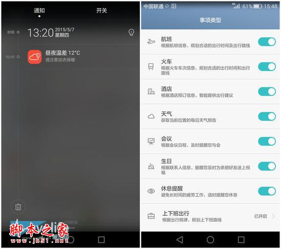 在用了一段时间后,我发现华为P8在某些时候会跳出提醒,来告诉我“昼夜温差达到了12度,请注意保暖”,仔细查找了设置后我发现,这是华为 EMUI3.1中的情景智能功能在发挥作用,简单来说,这一功能能够管理你的行程,通过使用时间的增长,情景智能会越来越了解你的使用习惯。