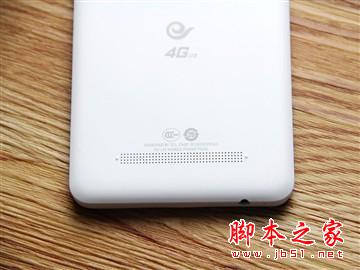 机身背部底部搭载扬声器,扬声器两侧有两个凸起的小点,防止平放时阻碍声音流出。中间为电信4G logo。