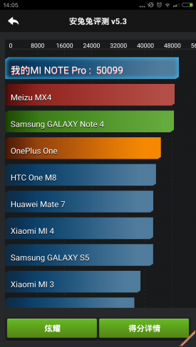 性能部分我们还是通过跑分来对手机进行性能测试,不过,在测试开始之前,我们还是先看下小米note顶配版的基本配置参数。小米note顶配版搭载了高通骁龙810 八核64位处理器 ,采用4GB LPDDR4 内存。从参数来看,该机的配置显然是目前市面上最强的安卓手机,那么它的性能与跑分如何,下面我们就采用三款常规基准软件进行测试。