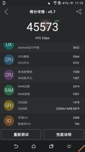 小结:通过安兔兔的得分来看,超过40000的分数可以算入旗舰机的行列,但是通过得分详情来看,在3D绘图这里的得分仅有6879分,正常的旗舰产品一般都会上到10000+的分数,所以可以确定的是,2K屏幕确实拖累了该机的性能。从NenaMark2的59.6fps来看,该机的图形图像处理器性能较为强劲,一般来讲,成绩超过40fps应付大部分游戏都是没有问题的。