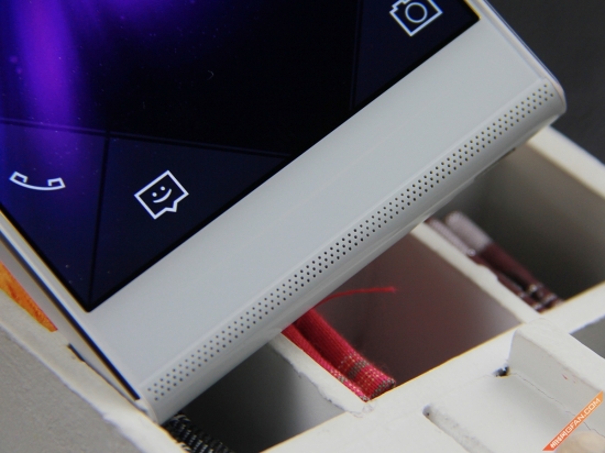 正面下方下巴部位与额头部位设计相同,将第二组扬声器与麦克风进行了集合,并通过与额头部分相同的网状设计来造成一种首尾呼应的感觉,同时需要值得一提的是,机身正面额头与下巴部分的网点开口加工的十分平整。