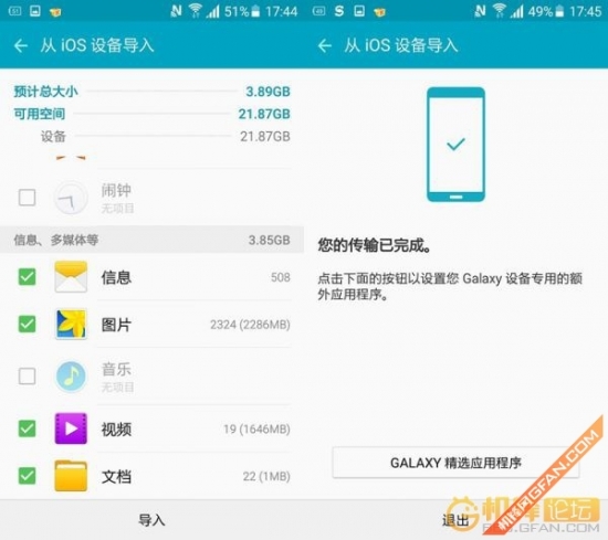 以前每次换手机,联系人、信息、照片等各类信息传输到新手机是一件很麻烦的事情,虽然后来有了各种工具实现手机对手机直接传输,不过基本上都得安装软件才行。S6自带了smart switch软件,其实这类软件现在好多手机厂商都在提供,既然已经预装了,就直接使用了,惊喜的是从水果手机把资料传输到S6不需要在iOS上安装任何客户端,方便极了。