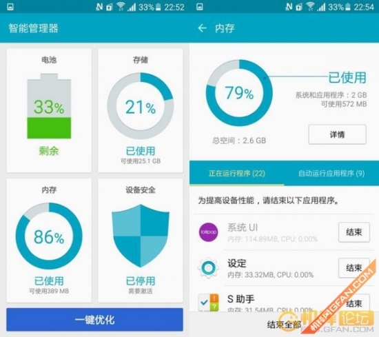 作为安卓系统,开发的平台固然有很多优势,不过也存在许多弊端,各类非正规渠道获得的APP广告肆虐,甚至偷跑流量,留下后门。不过S6自带了智能管理器,对手机电池、存储、内存及安全做了全面的管理,可以在很多程度上改善安卓的弊端。作为多任务的安卓系统,再大的内存也需要合理的管理,智能管理器在内存管理上比第三方软件要好用很多,毕竟作为系统底层的内存,需要更全面的了解系统才能做到有效优化。