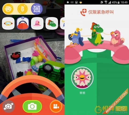 儿童模式下的相机也非常有趣,不仅操作按钮非常符合儿童使用,还可以在照片拍摄的时候添加各种贴纸,增加孩子的拍摄兴趣。在通话功能上,孩子只可以拨打家长指定的联系人,也非常符合孩子的特点。