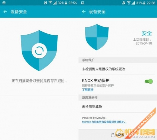 管理器自带的KNOX主动保护软件,来自大名鼎鼎的McAfee,这绝非是普通第三方杀毒软件可以比拟的,在深度合作基础上,杀毒软件能够对系统更加快速精确的扫描,优势肯定不言而喻。