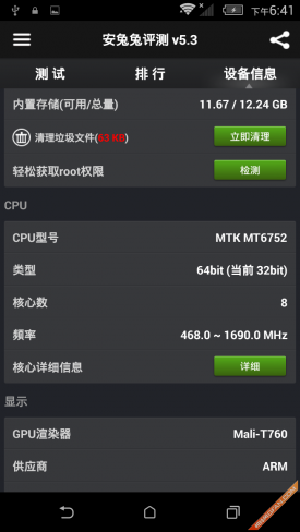 通过以上几项测试可以看到,MT6752在CPU八核全开下,性能表现相当出色,得益于新的Cortex-A53的架构和28nm HPM工艺,CPU在实际有着很不错的表现,发热降频严重的情况很少见。