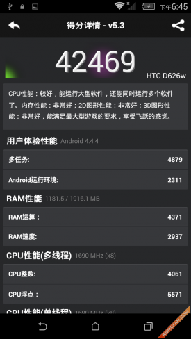 总的来说,HTC Desire 626w所搭载的联发科MT6752在性能方面有了巨大了提升,八个A53核心在处理速度方面变的更明显了,加上该机系统优化的好,无论是多任务运行、大型3D游戏、高清视频播放等都可以胜任。加上Desire 626w出色的时尚外观设计来看,HTC Desire 626w绝对称得上1500元档位的佼佼者。