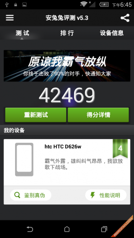 HTC Desire 626w在安兔兔跑分测试中取得了4万2左右的分数,可以说该机在使用同样处理器的手机中属于佼佼者,这样的分数可以媲美现有的骁龙801处理器,而骁龙615则要远远落后于MT6752。得益于内置八个物理核心,CPU多线程取得较高的成绩,这对于一款一千元左右的手机来说相当难得。
