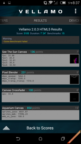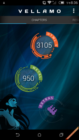 Vellamo是由Qualcomm(高通公司)开发的一个基准测试应用(类似于Neocore),它可以让你对手机浏览器的性能及稳定性进行测试,包括像Java脚本性能、渲染、联网和用户界面等。该工具的结果同样包括多个子项,但我们只取总成绩,分数越高则表明手机对浏览器的优化程度越高,网页浏览体验更好。