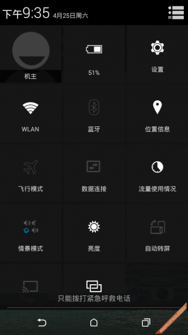 通知栏采用双页模式,默认页为通知内容,点击右上角可切换为快捷设置页,这样的交互方式稍显繁琐。
