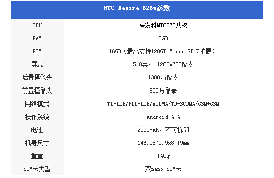 HTC Desire 626是一款性价比超值的手机,其采用了5.0英寸屏幕,分辨率为1280x720像素,搭载联发科MT6572处理器,辅以2GB RAM容量以及16GB ROM存储空间,并且配备了前后各500W和1300W像素的摄像头,支持4G网络。