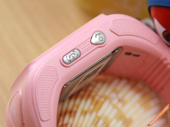 在阿巴町爱随行智能手表的右侧,还有两颗按键,分别为:开机键与挂断键以及亲情3键。