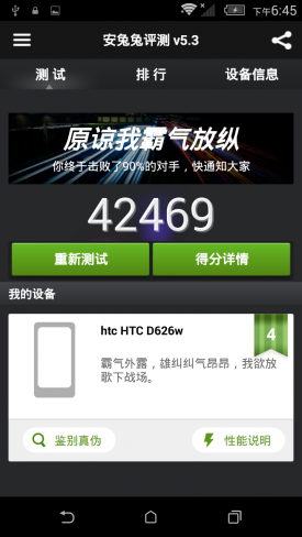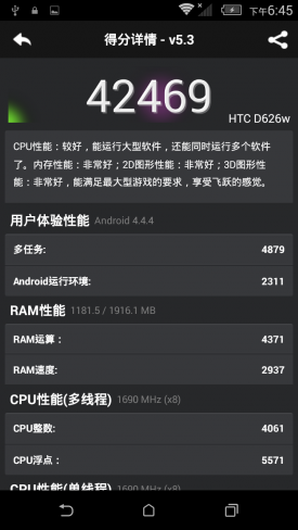 小结:通过测试可以发现,作为一款中端机型二者的性能表现大致相同,不过因为HTC 626W的CPU要略强于华为P8青春版,所以跑分上也要略高于华为P8青春版,当然两者的成绩应付日常影音游戏是完全没有问题的。