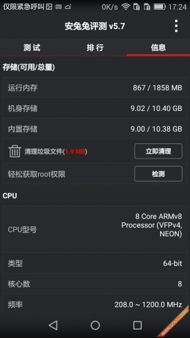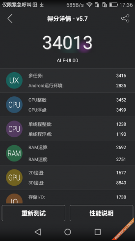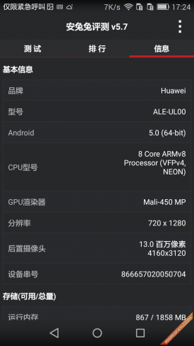 华为P8青春版搭载是64位麒麟620芯片,配备Mali 450MP4 GPU,辅以16GB ROM+2GB RAM。但从硬件配置上来看,华为P8青春版的配备是属于行业主流标准的,那么性能到底表现如何呢?我们接下来就来通过一组跑分,来综合考验一下华为P8青春版的硬件性能。
