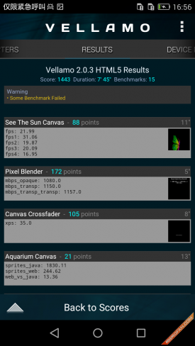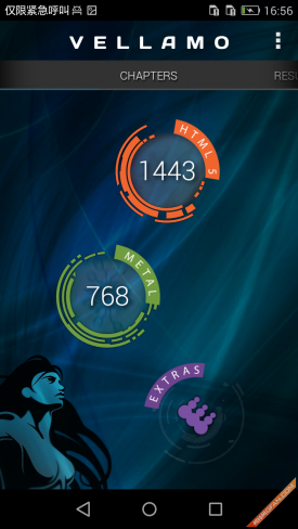 Vellamo是由Qualcomm(高通公司)开发的一个基准测试应用(类似于Neocore),它可以让你对手机浏览器的性能及稳定性进行测试,包括像Java脚本性能、渲染、联网和用户界面等。该工具的结果同样包括多个子项,但我们只取总成绩,分数越高则表明手机对浏览器的优化程度越高,网页浏览体验更好。