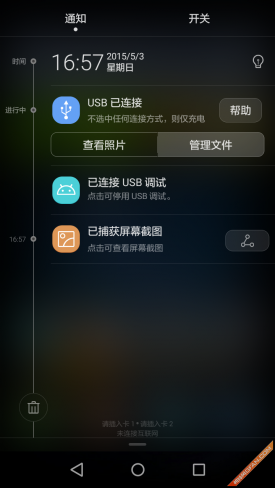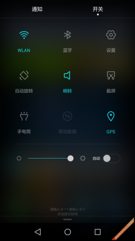 下拉任务栏为两大功能区,左边为通知栏,在这里大家可以看到时间、通知信息,右边则为一些常用工具的快捷开关栏。